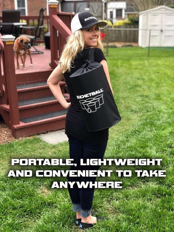 PORTABLE! LIGHTWEIGHT! CONVENIENT! BucketBall is portable, lightweight and convenient to take anywhere on the go. BucketBall weighs less than 7 pounds. When BucketBall is setup for game play, it is just as large as cornhole. However, when BucketBall is packaged inside it's tote bag, it takes up less than a cubic foot of space.