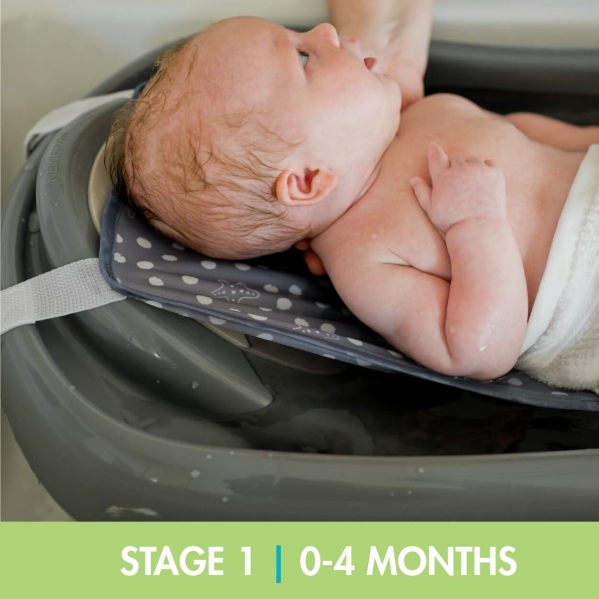 The First Years is finding new ways to make your favorite products even better. Our Sure Comfort® Renewed Newborn to Toddler Bathtub is the same as our best-selling bathtub, but made with 50% recycled plastic for less reliance on fossil fuels. The tub includes a comfortable infant sling and easily grows with your child through three stages. The mesh sling cradles your little one to provide them with extra comfort and support during newborn baths, making it a perfect infant bathtub. The added security of the form-fitting netting helps make bathtime less stressful for both new parents and baby. Remove the sling and the second stage of this 3-in-1 baby bathtub features a deep ergonomic design that steadies your growing baby better during bathtime with a comfortable recline and padded headrest. And the specially designed bump built into the bottom will help keep that tiny bum from sliding down. Later, active toddlers can sit up comfortably and have room for bathtime fun on the toddler side. This grow-with-baby design ensures you’ll be able to use this baby bath from infant through to toddler, and does it in a more sustainable way! Forget the old way. Try something Renewed!