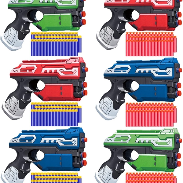It includes 6 nerf guns with at least 10 bullets per gun and four inflatable barriers with air pump included.