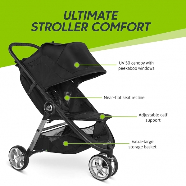 The Baby Jogger City Mini 2 is the lightweight and compact 3-wheel stroller the world has come to love, now in an eye-catching, sleek design that makes it remarkably nimble and ready for adventure. Enjoy the signature one-hand compact fold of City Mini 2, with exciting new features such as adjustable calf support and a near-flat seat recline that provide added comfort. An extra-large storage basket (accessible from the front as well as the rear) and a UV50 canopy with peek-a-boo windows provide ultimate convenience.