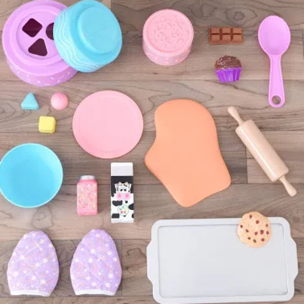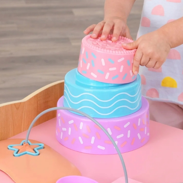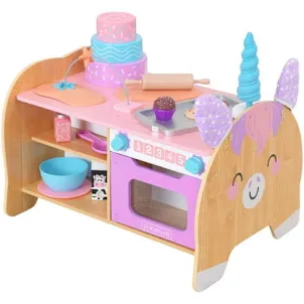 Designed for curious toddlers, the adorable KidKraft Foody Friends: Baking Fun Unicorn Activity Center combines baking and learning into one! There are plenty of hands-on activities just right for emerging bakers—knobs to turn, trays to slide, dough to roll and cookies to cut. A recipe-inspired maze and shape-sorting cakes aid in coordination and fine motor skills. Hidden surprises such as the oven mitt ears and removable unicorn horn complete the magical fun time. With a selection of cooking utensils, bakeware and ingredients, this unique animal-themed Baking Fun Unicorn Activity Center by KidKraft is a recipe for fun.
