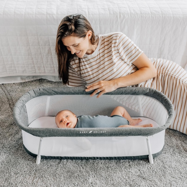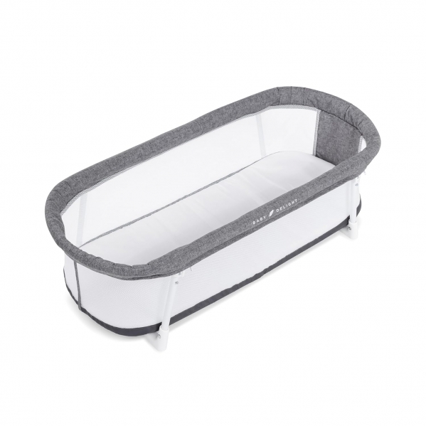 The Snuggle Nest™ Bassinet creates a comfortable spot for your baby to sleep and relax – at home and on the go. The updated design features two rigid, 9 inch tall vented walls with fold out legs creating a secure space for your baby to sleep. The tall walls are lined with a soft, comfort-mesh helping to provide ample air circulation and breathability. Because we know little ones can be messy, the included sheet and mattress along with the bassinet's cover can be removed and machine washed. The Snuggle Nest Bassinet™ conveniently folds up in seconds and can be put into the included carry bag for travel or storing.