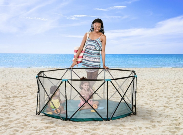 f you're looking for a play yard for your little one that is truly portable, check out the Regale Eight Panel My Play Portable Play Yard. Creating a safe play area for your child in seconds, the lightweight, foldable, play yard is ideal for at home, when traveling, at the park or a day at the beach. Boasting an all-steel construction, this attractive play yard measures 62" wide and 26" high and was built with durability and strength in mind. Equipped with soft, ventilating mesh sides and an easy cleaning nylon bottom, the yard easily accommodates children between 6-24 months. Taking only a minute to set up, the portable play yard is ideal for indoor and outdoor use.This safety gate has been certified by the Juvenile Products Manufacturers Association (JPMA). It also meets the safety standards set by the American Society for Testing and Materials (ASTM).
