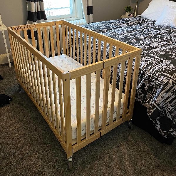 This is a sturdy, modern full size wooden crib. Very easy setup! It comes with a firm, Greenguard Gold certified mattress suitable for both infants and toddlers, a mattress cover and organic cotton fitted sheet from Pottery Barn Kids.
