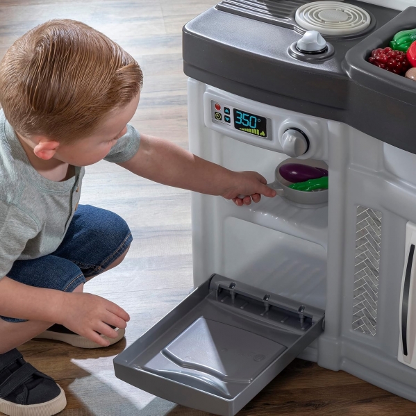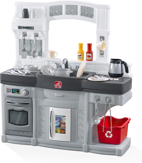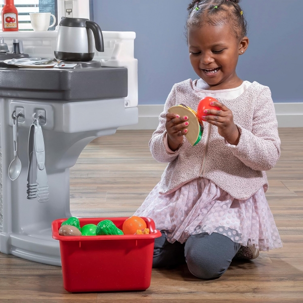Play kitchen including pots, pans, and food!