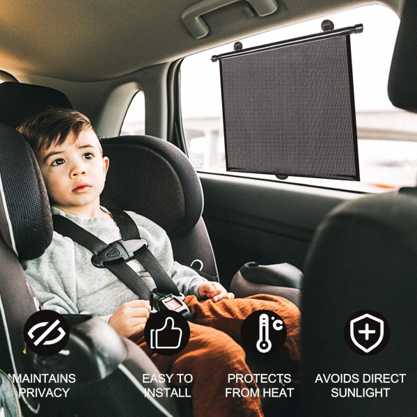 This is a set of 2 car window sun shades. They measure about 17.7"L x 15.7"W. These will suction to clean car windows and have a retractable shade. Help keep the sun out of your little ones eyes while riding in the car. (Brand may vary).