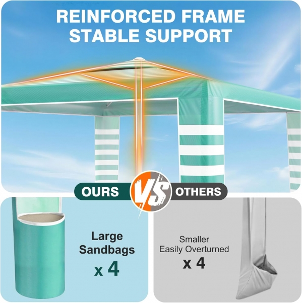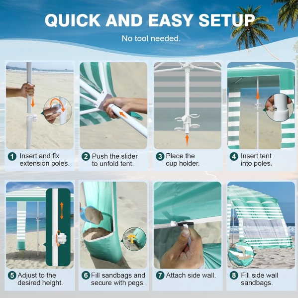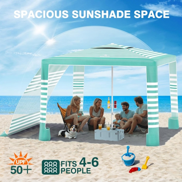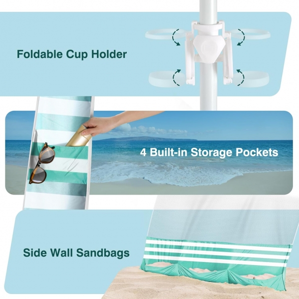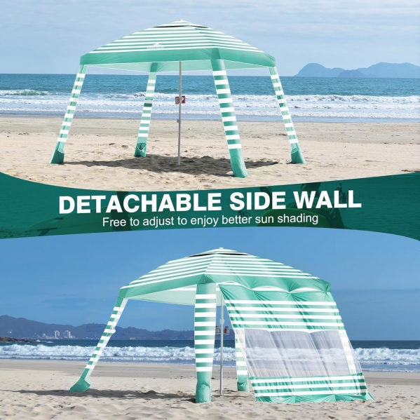 Compact and lightweight for easy transport to the beach! This cabana features UPF50+ protection, easy setup, a removable side wall for added shade and privacy, and fillable sand pocket for easy anchoring.