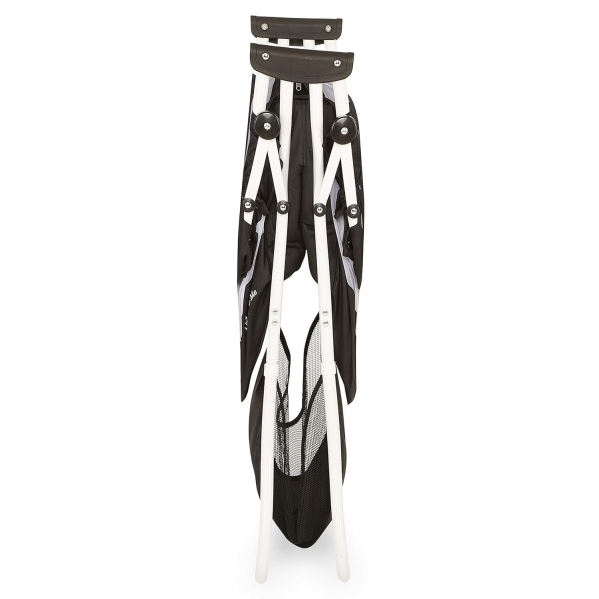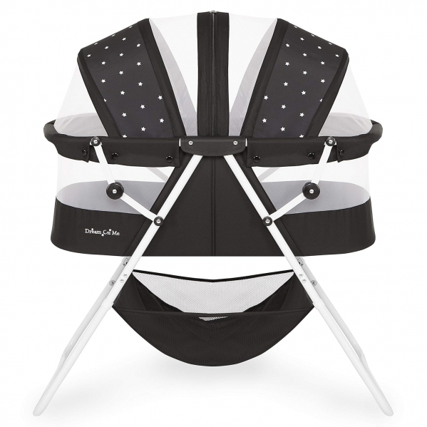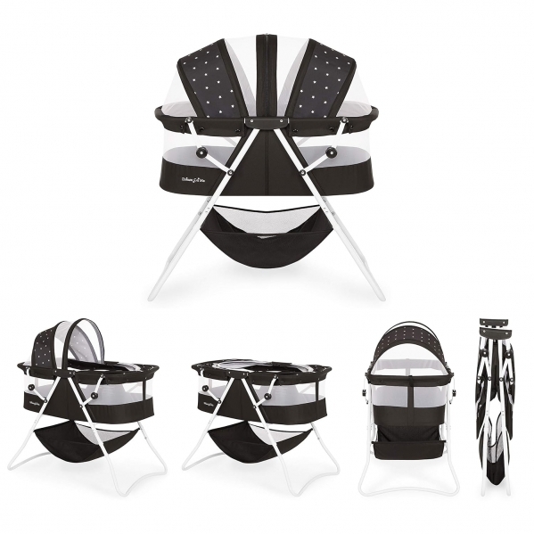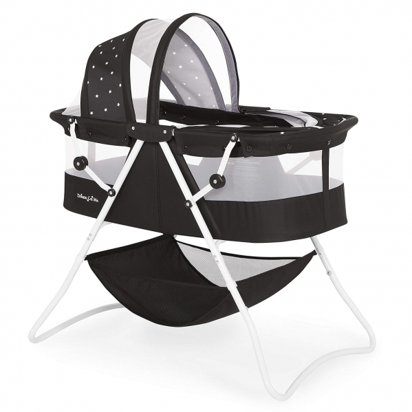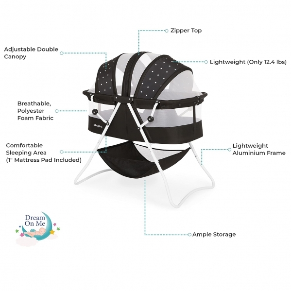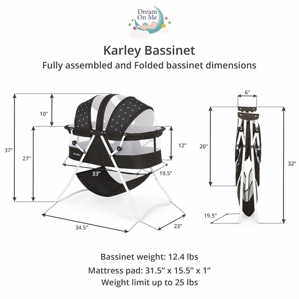 Lightweight and portable, easy to move from room to room. Quick-folding aluminum frame, no tools needed. Spacious and airy with a double canopy and large storage bag. Mattress pad: 30L × 15W × 1H in. Bassinet: 33L × 19.5W × 27H in (37H with canopy). Fits newborns up to 25 lbs.
