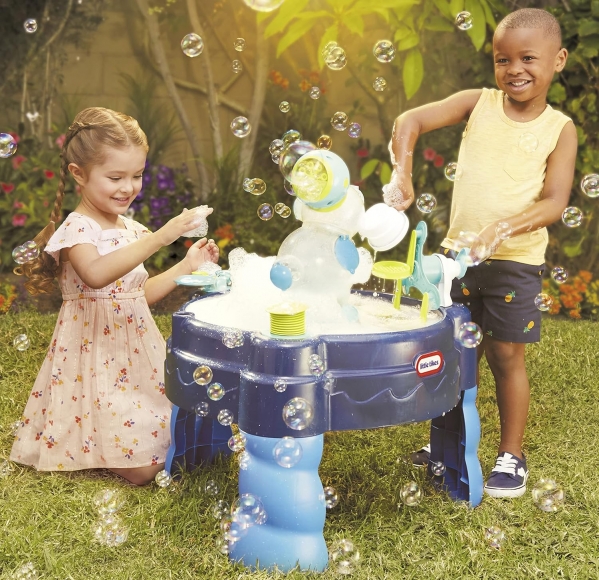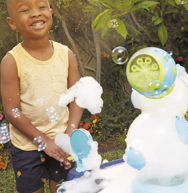 Bubbly, foamy fun all in one! This water table features a motorized bubble and foam machine, a foam-spilling tower, and a spinning Ferris wheel that scoops foam for interactive play.
