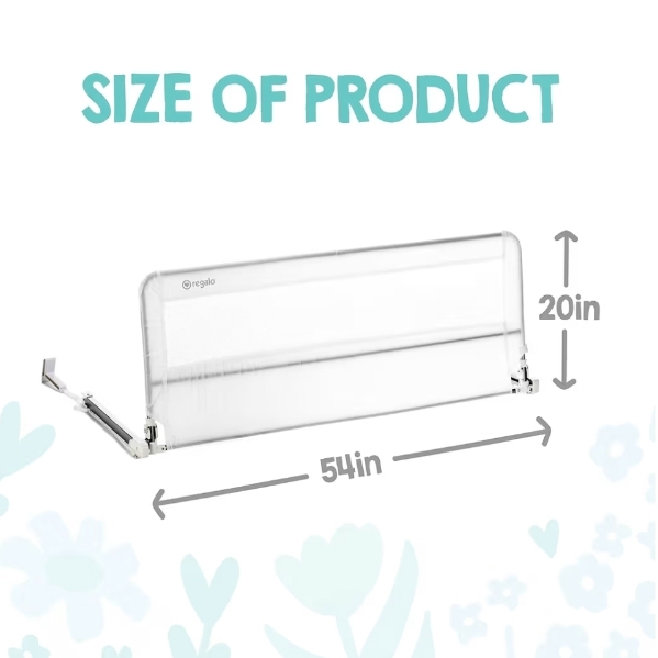 Keep your little sleeper safe with the Regalo Extra Long Swing Down Bed Rail. The swing-down design makes it easy to access the bed or change sheets, while the sturdy steel frame provides reliable support. Measuring 54" long with a 20" sidewall, it’s ideal for thicker mattresses and fits up to a queen size bed. The Gap Guard feature helps prevent gaps between the mattress and rail, and setup is quick with no tools required.