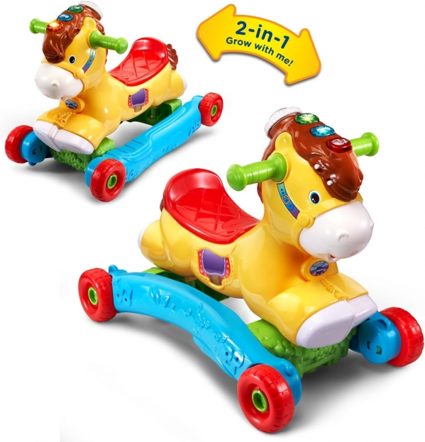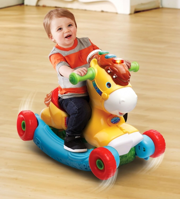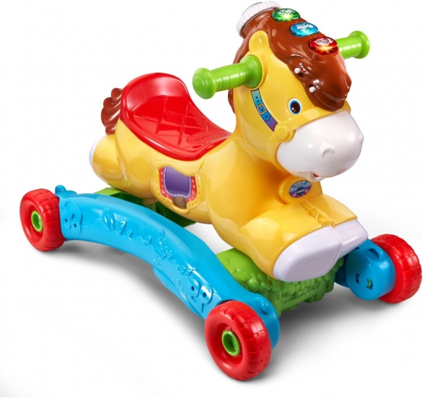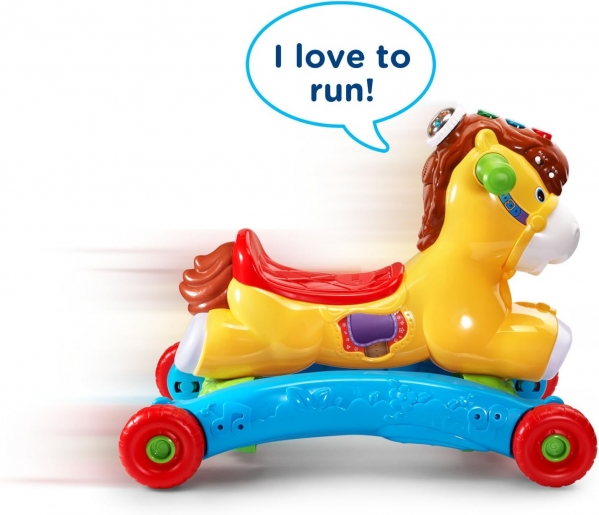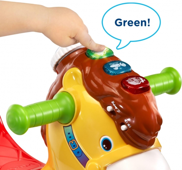 Gallop and Rock Learning Pony easily converts from a rocking horse to a ride-on toy. Motion-activated music and realistic horse sounds encourage movement and imaginative play, while colorful buttons introduce colors and action words.