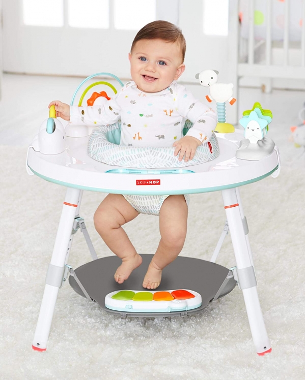 Color:Silver Lining Cloud Activity Center designed to grow with baby in three stages, Skip Hop Silver Lining Cloud baby's view activity center is an action-packed take on our best-selling gym. Featuring the same developmental approach to play and learning as our explore & more version, The decor-friendly design features a 360-degree rotating seat that turns and stretches for bouncing. Our unique discover window gives little ones a clear view of their feet as they play The light-up piano to connect cause and effect. Four dreamy toys can be rearranged for customized play. As baby grows, the activity center converts for easy cruising. At stage three, it transforms into a sturdy Toddler table with a plastic chalkboard surface for drawing, playing-the sky's the limit.
