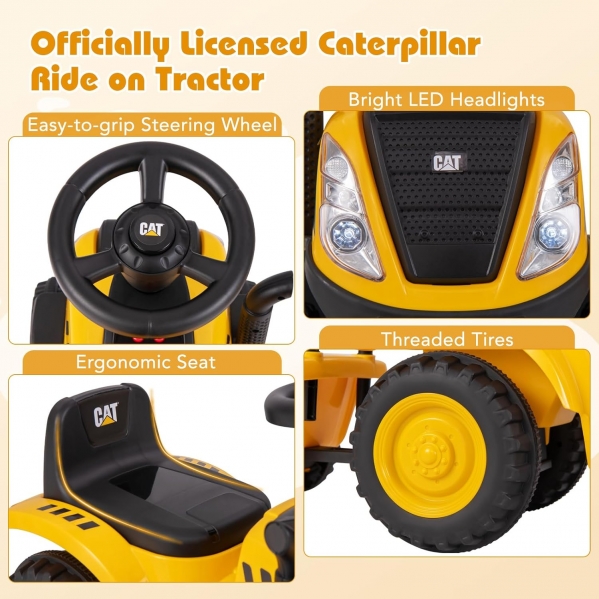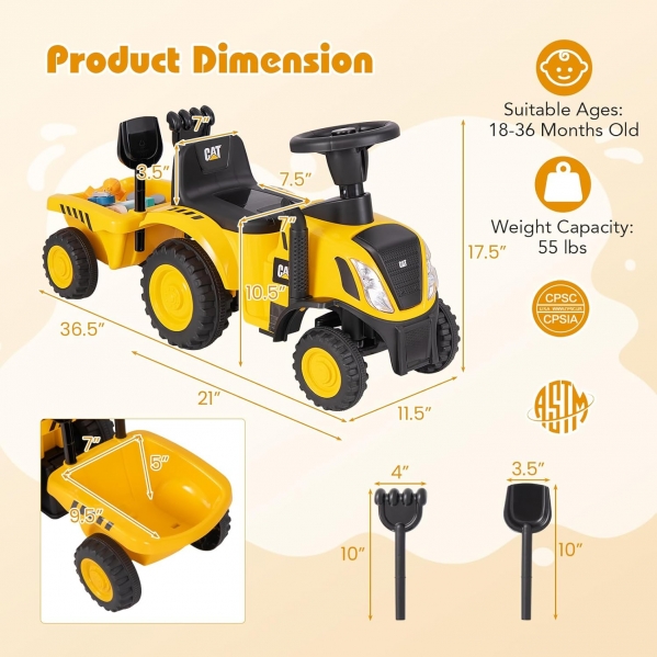 • This officially licensed Caterpillar tractor for toddlers doubles as a foot-to-floor sliding car or a ride-on tractor with a detachable trailer that offers ample storage space for toys, snakes, plants, and leaves. The tool-free detachment ensures children can start driving immediately.