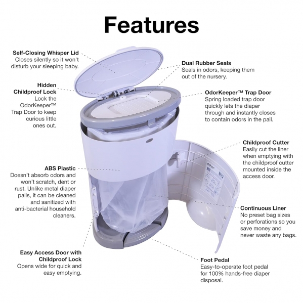 Color:whiteWho’s excited about changing diapers 6,000-9,000 times per child? Dekor Hands-Free Diaper Pails are designed to make this unpleasant chore as easy as possible for you AND your budget. Unlike other disposal systems where you have to bend over, operate a lid, or shove a soiled diaper halfway inside the can, Dekor pails are 100% hands-free. After a diaper change, you are likely to have baby in one arm and the soiled diaper in the other. No one has a third hand to operate the diaper pail. Just STEP on our foot pedal AND DROP the soiled diaper through the trap door. No squishing, twisting or cramming. No other diaper pail on the market is as easy to use! A childproof lock keeps curious toddlers out. Continuous liners allow you to empty the pail whenever you want, using only as much refill as you need. Simply cut the refill with the kid-safe cutter located inside the access door, discard, and tie a new knot in the remaining bag. You don’t need to waste a full bag to empty a partially-full pail. There is an effective triple odor control that keeps smell in the pail. First, the spring-loaded trap door shuts immediately after the diaper passes through. Next, rubber gaskets on the trap door and the top lid tightly seal odors inside the pail. Finally, the refillable liner helps neutralize odors with a pleasing baby-powder scent. Because all our pails are made with closed-cell ABS plastic, they cannot absorb odors like cheaper plastics, will not dent, and are scratch- and fade-resistant. You’ll be able to use our product long after your little one is out of diapers. Simply pop out the diaper insert and use in the bathroom, kitchen, or garage. Great for use with cloth diapers with the Dekor Cloth Diaper Liner. The Dekor Classic holds up to 45 newborn diapers; and is available in the following colors: White and Gray.