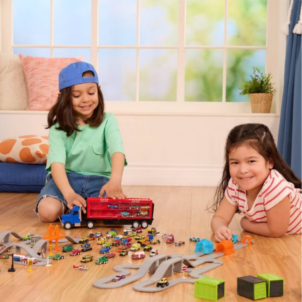Miniature city playlet includes approximately 15 vehicles, 116 tracks, a gas station, a construction crane, a bridge and car carrier truck. Recommended for ages 3+