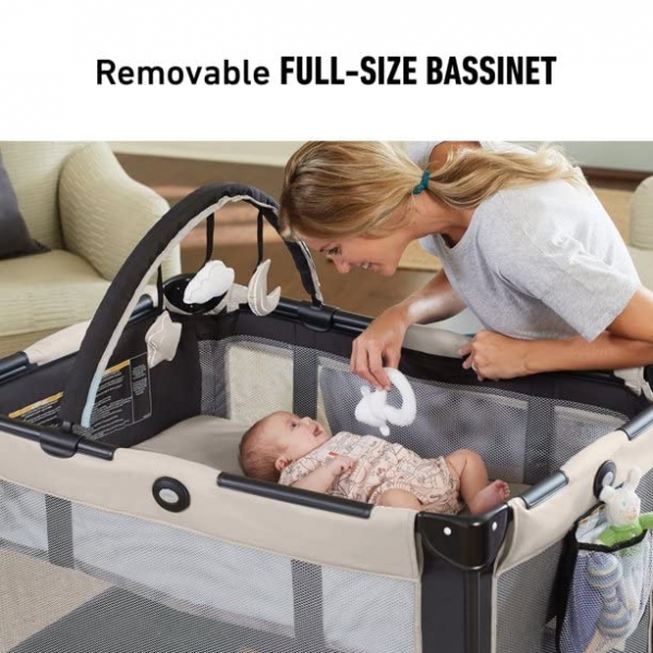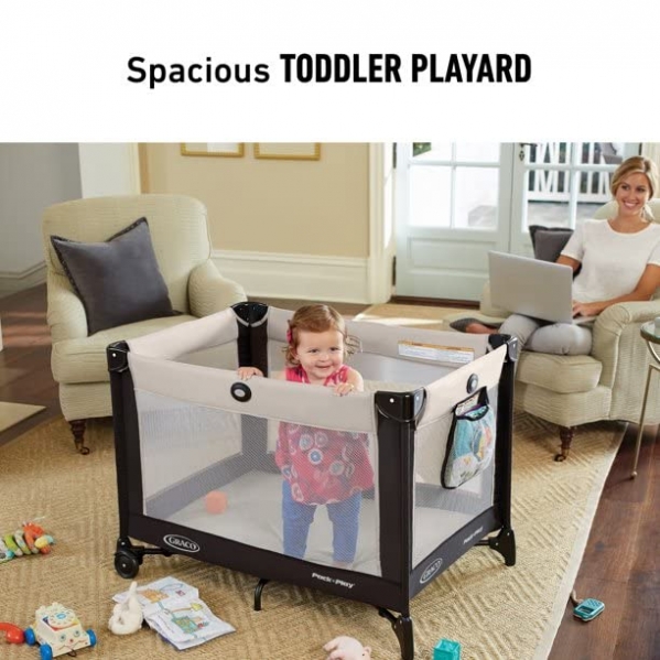 Keep your little one happy and comfortable no matter where you go with the Graco Pack 'n Play On the Go Playard. A removable full-size bassinet folds with the playard for a quick setup and fewer parts to carry. Folding feet and wheels allow for a compact fold, while the durable frame makes it perfectly suited for travel. The signature Graco push-button fold allows you to break it down quickly and hassle-free.