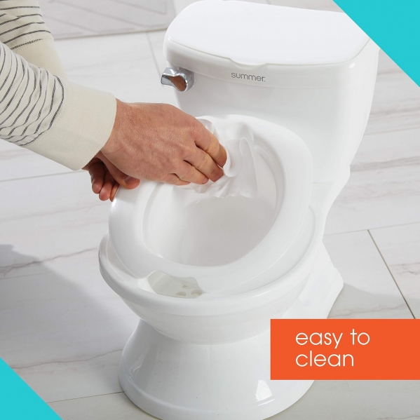 The Summer My Size Potty Train & Transition is your solution to potty training. Help your little one transition from My Size to real size with this 2-in-1 potty training system. My Size Potty Train & Transition looks and feels just like an adult toilet, making it the perfect tool for fast and effective potty training. The removable, soft foam potty topper can be placed onto the adult toilet for a smooth transition. Features include realistic design and flush sound, soft foam potty topper with storage hook, full-size wipe compartment, removable bowl, and integrated splash guard.