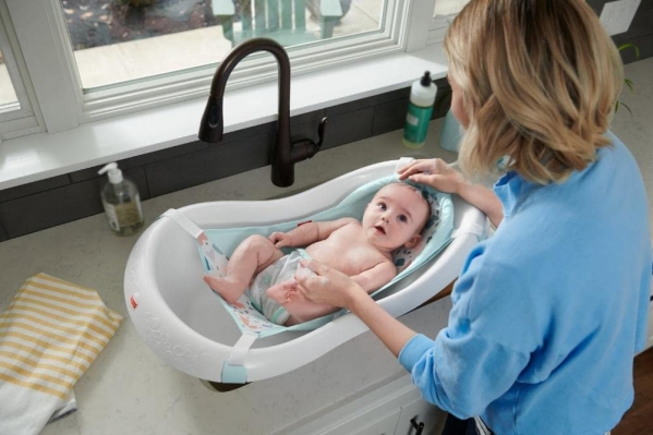 Traveling with your little one? Make bath time simple and stress-free with this 4-in-1 tub. It includes a soft mesh sling for newborns, an infant support for extra comfort, and a “sit-me-up” seat that helps older babies feel secure while splashing. When your child is ready, it converts into a roomy toddler tub.