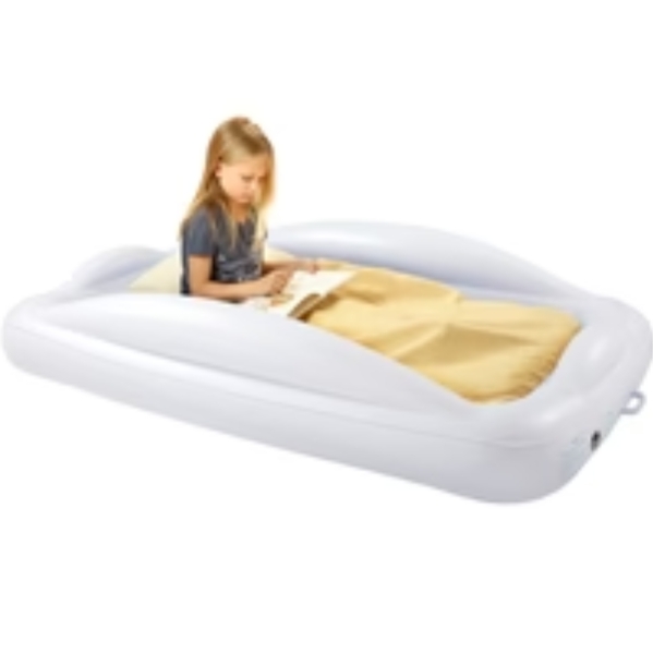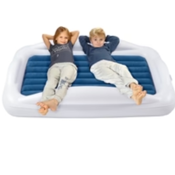 It inflates quickly with the included electric pump and deflates just as fast. Parents love it for vacations, sleepovers, and hotel stays — and kids love having their very own bed!