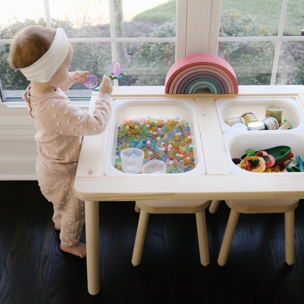 This children’s desk becomes both a practical place for sensory activities, arts and crafts. The top of FLISAT children’s table consists of two lids that fit TROFAST storage boxes. Your child can keep toys at hand at all times – and clean up in a jiff!