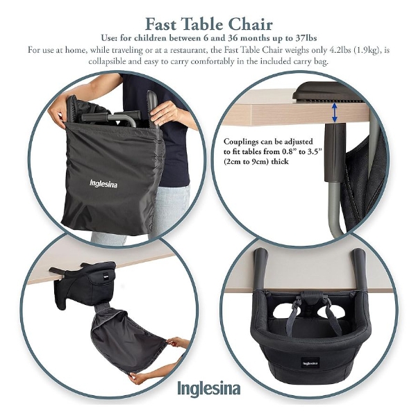 The Inglesina Fast Table Chair is a secure, portable high chair that clips directly onto most tables, giving your little one a comfortable seat at mealtime. Designed with parents and babies in mind, from its quick set up at most tables to its durable construction.