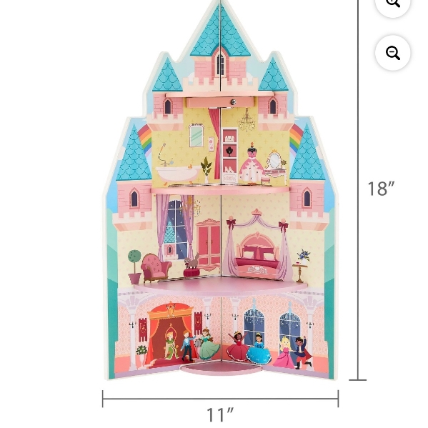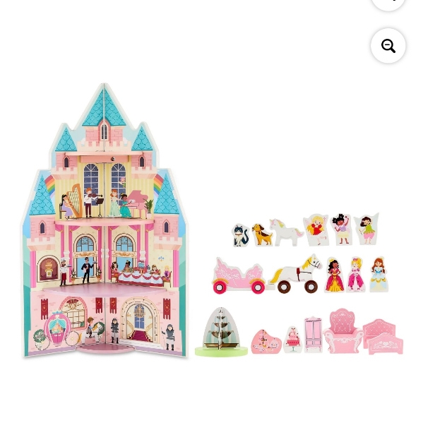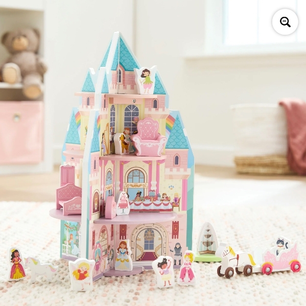 The princess castle is three-sided and provides hours of interactive play. Let your child's dreams come true with this whimsical play set. Spark Create Imagine wooden princess castle includes 17 pieces. The pieces included are a moveable horse, moveable carriage, 3 princesses, 3 fairies and much more! Recommended for children ages 3 and older. Easy to assemble. Made from FSC wood. FSC wood is the gold standard for wooden toys. Spark Create Imagine wooden princess castle is made from environmentally friendly materials. The princess castle uses non-toxic coatings. The castle is tested and certified by internationally recognized laboratories.