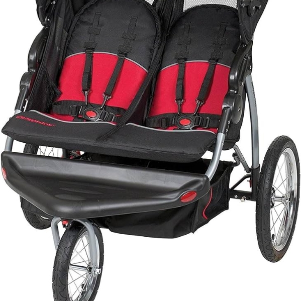 The Baby Trend Double Jogger is a great option for parents who have twins. With the locking front swivel wheel, it makes maneuvering much easier and includes pneumatic bicycle tires. The ratcheting shade canopy provides shade and comfort. A convenient parent tray includes two cup holders and covered storage compartment. Convenient features also include a large storage basket, multi-position seat recline and quick and easy compact fold. For safety, a 5-point safety harness will keep your child secure while on the go. . It is highly recommended that the children are at least 6 months of age up to 50 pounds or 42".