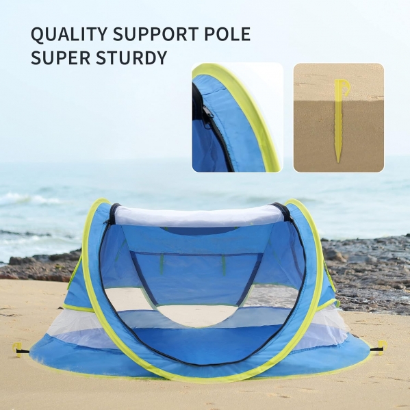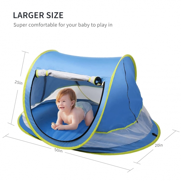 A pop up tent to shade your little one at the beach or outdoors. It automatically pops up when taken out of the bag, and easily folds back up.