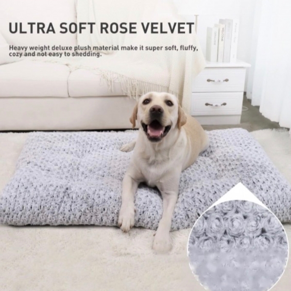 Ultra plush large dog bed perfect for your furry friend! It is 42x27 (for reference my 100 lb. German Shepherd uses the same size). This fits inside the large dog crate available for rent. I only use free and clear laundry detergent when washing with no perfumes or dyes and wash between every rental.