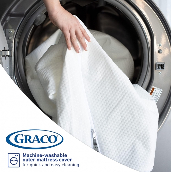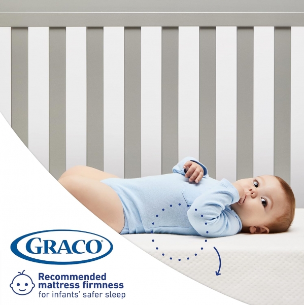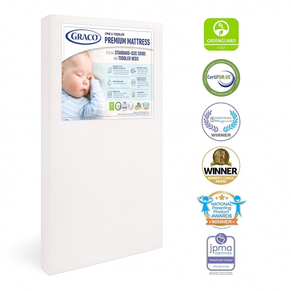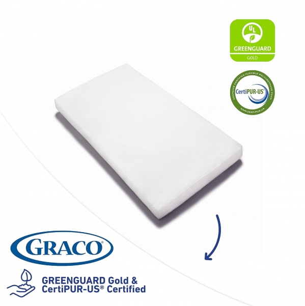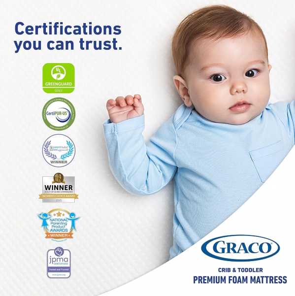 Introducing the Graco Premium Foam Crib & Toddler Bed Mattress, even easier to clean and care for. Proudly awarded the Parent Tested Parent Approved Seal of Approval and the 2020 & 2021 Women's Choice Award for 9 out of 10 Customer Recommended Crib & Toddler Mattress, the 2021 Edition Graco Premium Foam Crib & Toddler Bed Mattress is even easier to clean and care for, as it features soft (yet durable), removable, and water-resistant outer cover that can be conveniently machine washed. The Graco Premium Foam Crib and Toddler Mattress is GREENGUARD Gold Certified, meaning it has been screened for over 10,000 chemicals and volatile organic compounds (VOCs) known to pollute indoor air, and also CertiPUR-US Certified, meaning it is made without ozone depleters, mercury, lead, formaldehyde, and other heavy metals. This crib and toddler mattress is also JPMA Certified, meaning it has been expert tested by independent laboratories to guarantee this product meets the highest standards for your child’s safety. It is also expert tested to meet all applicable federal safety and flammability standards. This mattress is conveniently compressed in a lightweight box. For optimal performance, we recommend you unroll your mattress and allow to expand immediately upon delivery to allow maximum time for full expansion in a room temperature setting. Designed to fit any standard full-size crib and toddler bed. Mattress dimensions: Length (52 inches) x Width (27.6 inches) x Height (up to 5 inches); Weight (7 pounds). Mattress made of polyurethane foam. Backed by a 6-year limited manufacturer’s warranty. Graco crib and toddler mattresses are exclusively manufactured by Stork Craft Manufacturing (USA) Inc.