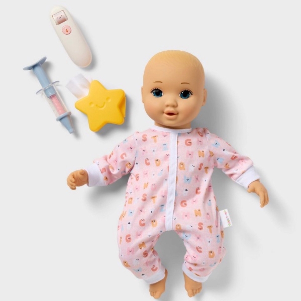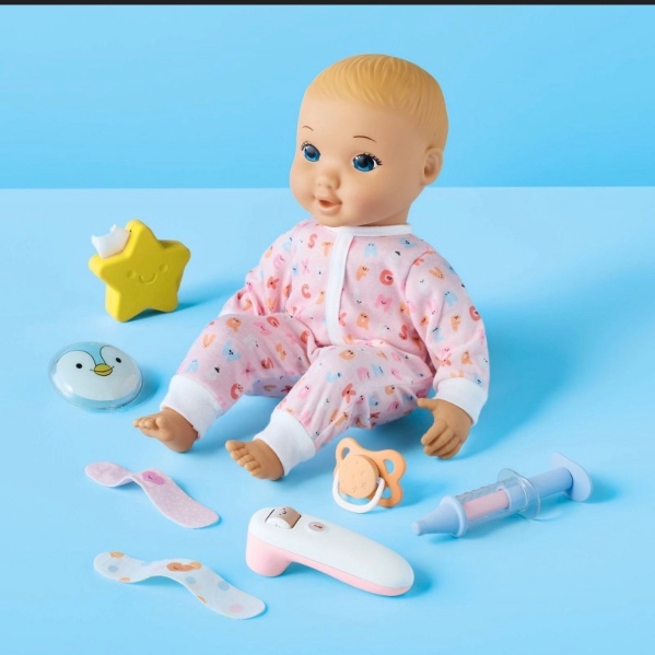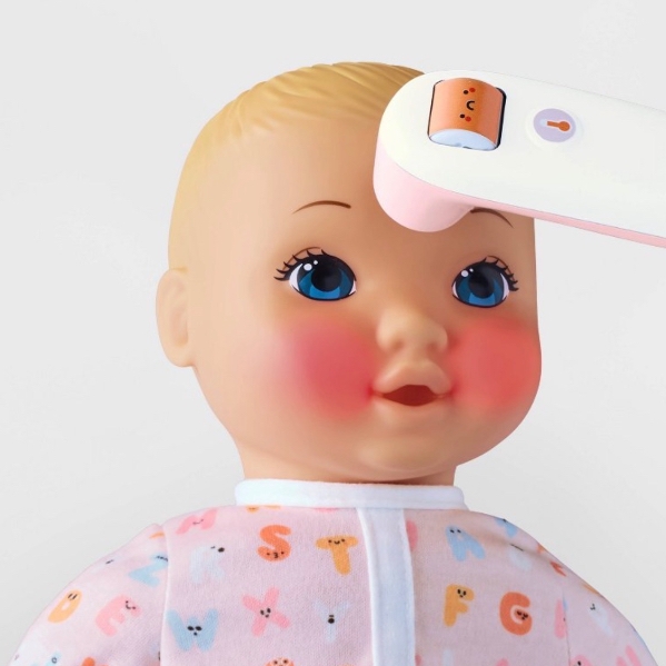 • 14-inch baby doll- cheeks light up red and baby cries when thermometer is pressed to forehead