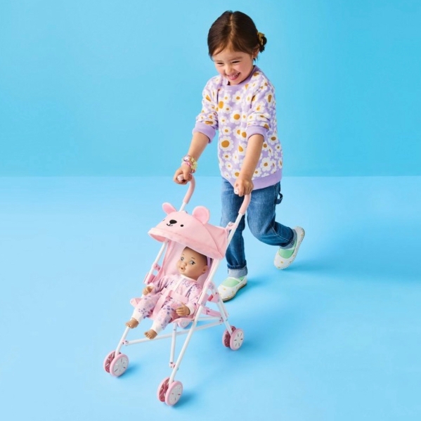 Keep your little one's playtime fun and engaging with this Take Care Baby Doll from Gigglescape™. The take care doll comes wearing a pink alphabet bodysuit and has blonde hair and blue eyes. The set includes bodysuit, toy bandages, syringe, two pacifiers, thermometer, ice pack and facial tissues so they can pretend to take care of a baby of their own. Also includes a stroller that actually folds up, a bib, bottle, and juice cup. Suggested for ages two and up. The pieces are great for promoting imaginative play.