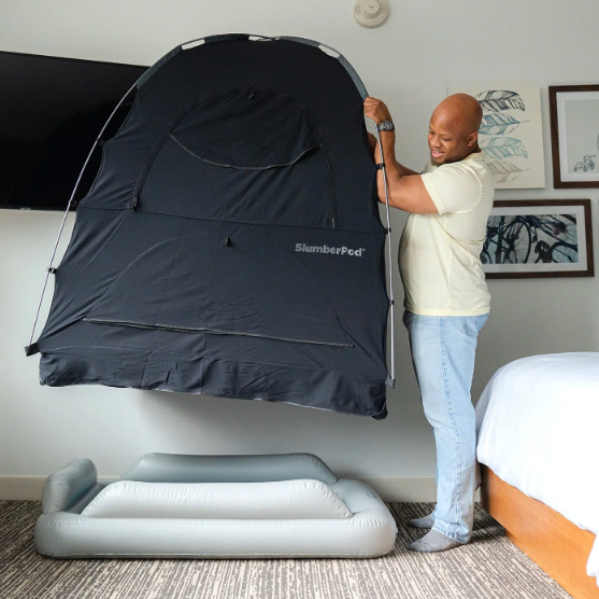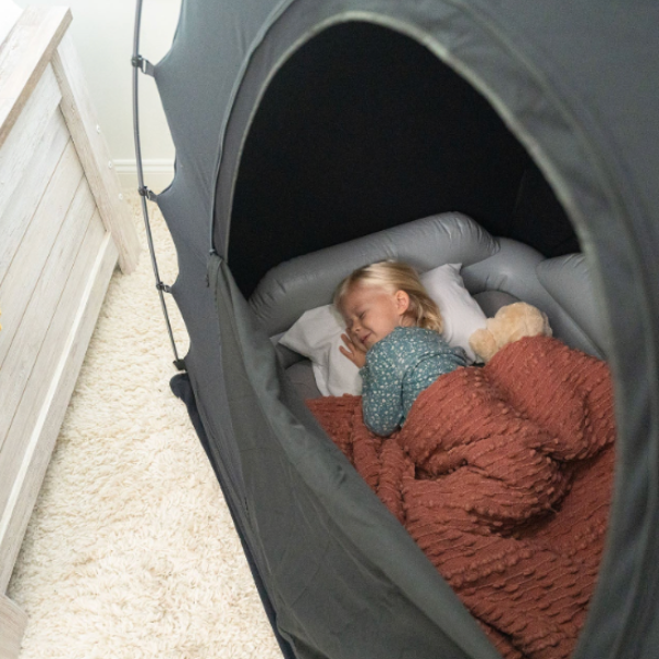 Includes a SlumberPod and a toddler air mattress with fitted sheet. The SlumberPod toddler bed should only be used with littles one 2 years old and ip.