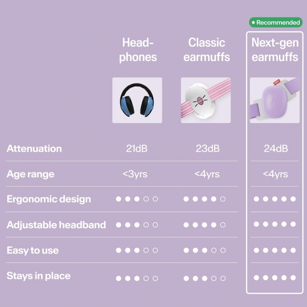 The Alpine Muffy Baby is specially designed to protect babies' extra-sensitive hearing from harmful noises and loud music at festivals, sporting events, fairgrounds, firework displays and motor races, for example. The earmuffs have a soft and adjustable non-slip headband that does not put pressure on the fontanel. The Muffy Baby is lightweight, prevents noise overstimulation and helps babies to rest undisturbed while traveling.
