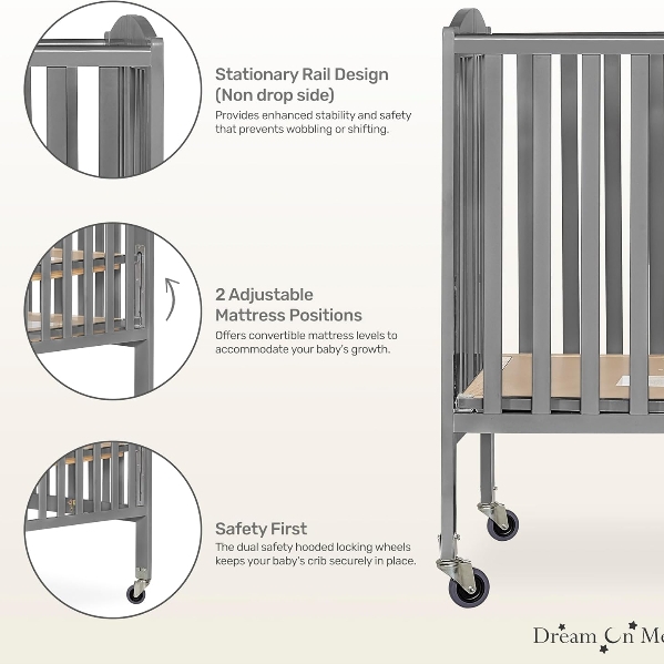 Our cribs meet/exceed applicable ASTM & CPSC standards. Enhanced safety features include the stationary rail design (non drop side) and dual safety hooded locking wheels.