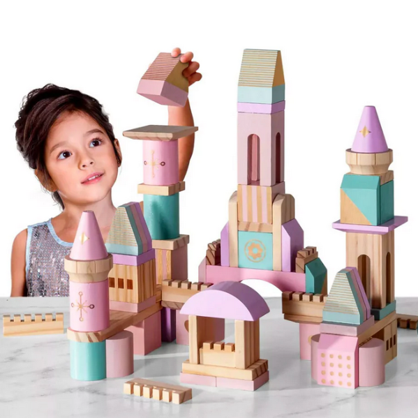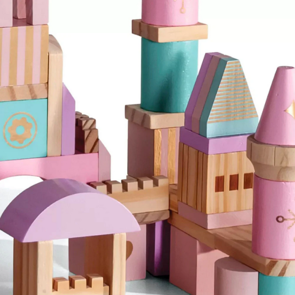 75 colorful wooden pieces for building castles, bridges, and towers. Made from smooth pine for safe, creative play that builds motor skills and imagination. Ages 2–5.