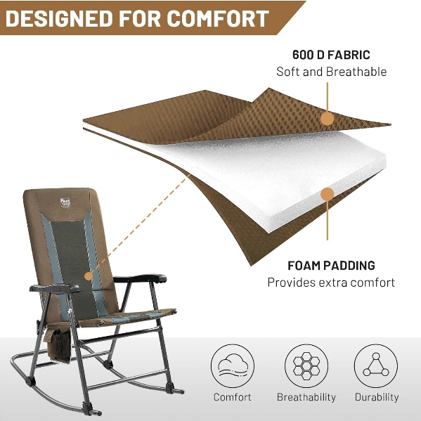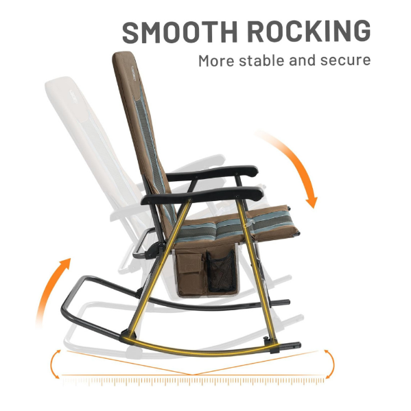Heavy-Duty 400lbs Capacity: The rocking camping chair features a reinforced steel frame and durable 600D Oxford fabric, ensuring it safely supports up to 400 lbs while delivering a smooth, stable rocking motion—ideal for adults of all sizes.