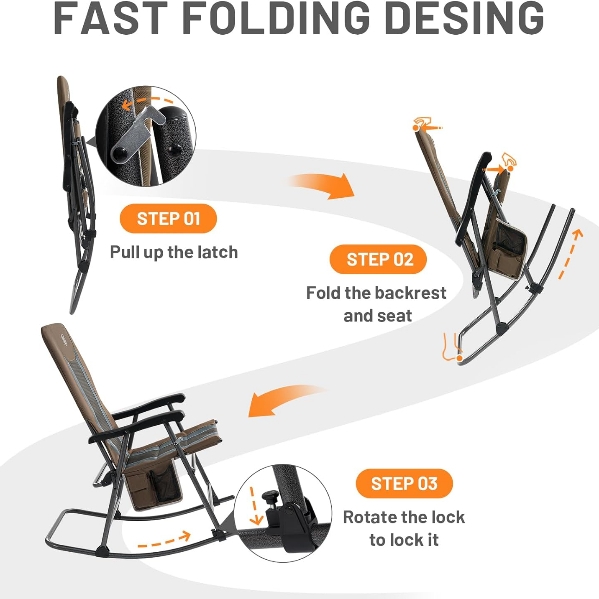 Quick-Folding: Folds flat to just 4.72" thick (36.6×28×4.72") and weighs only 14.4 lbs, making this oversized rocker chair easy to carry with the built-in handle strap. Sets up in seconds—no assembly needed!