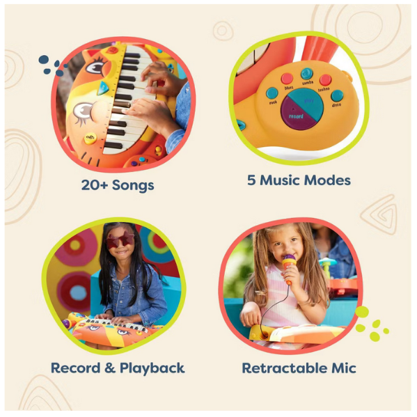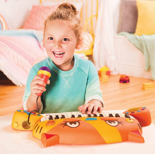 B. Toys Meowsic Keyboard – Encourage creativity and laughter with this interactive cat-themed keyboard. Kids can explore 5 instrument sounds, sing along to 20 songs, or record their own tunes. Built tough for toddler play and designed with smart features like auto shut-off and volume control.