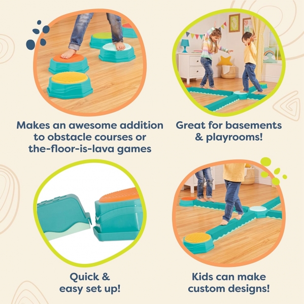 The sensory stepping stones feature textured, bumpy surfaces that add tactile fun while promoting gross motor skill development. This set helps keep kids active and engaged, whether indoors or outdoors. When playtime is over, the beams and footpads stack easily for quick storage, making it ideal for homes and vacation rentals.