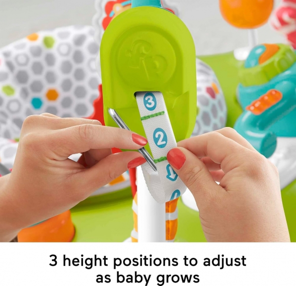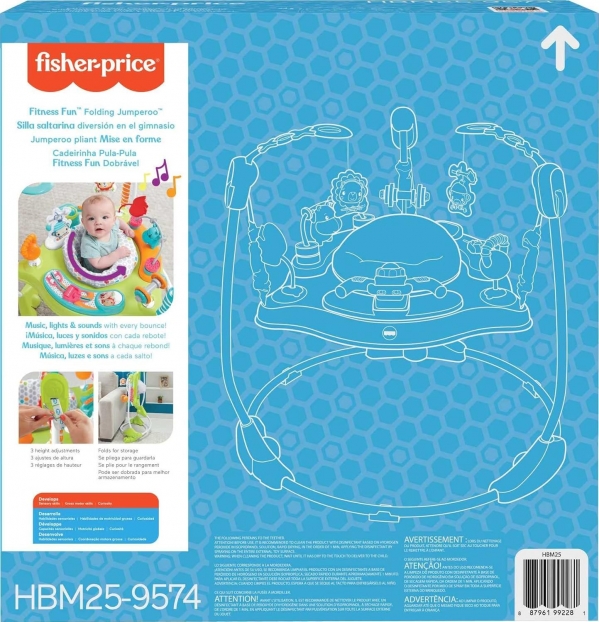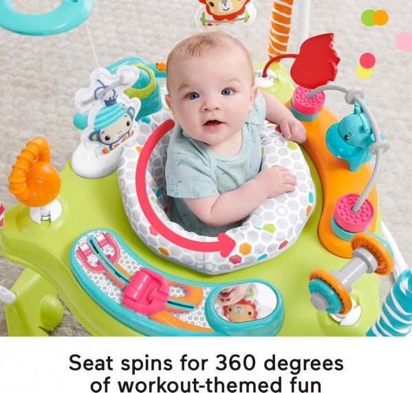 With the Fisher-Price Fitness Fun Folding Jumperoo Activity Center, your little one can bounce into a world of gym-themed fun! This activity center offers 360° of interactive play, featuring spin bike handlebars with lights and music, a roller ball, apple teether, hippo weightlifter bead bar, dumbbell-shaped clacker, mirror, resistance band slider, and a kettle bell rattle. The seat adjusts to three heights, so your tiny fitness enthusiast can keep bouncing, growing, and developing those important gross motor skills.
