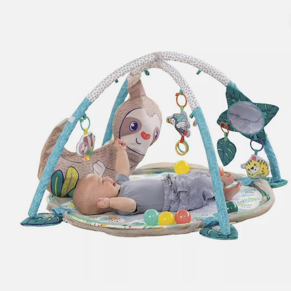 • Includes 40 easy-to-grip balls, 4 sensory toys, giant selfie mirror, and rainbow tummy-time bolster