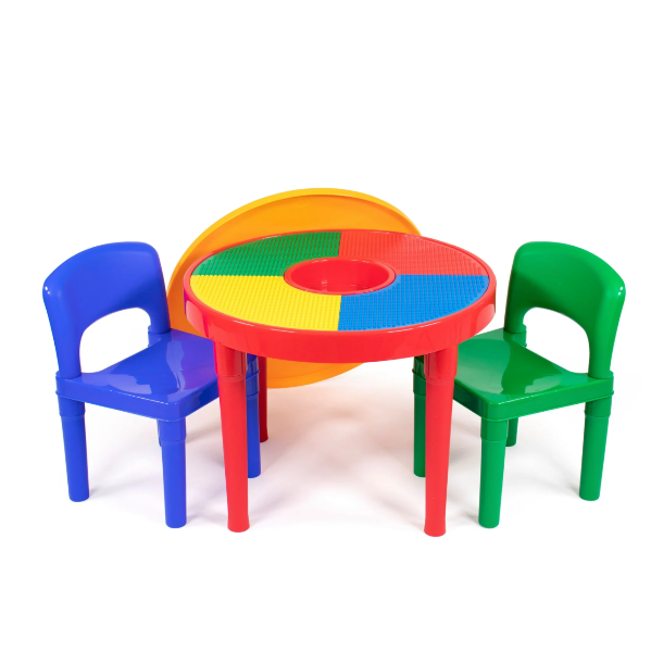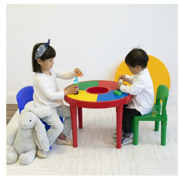 This versatile kids activity table comes with a LEGO-compatible base perfect for building, playing, and creating. It also includes 2 child-sized chairs, making it great for playdates, crafts, and creative fun at home or on vacation.