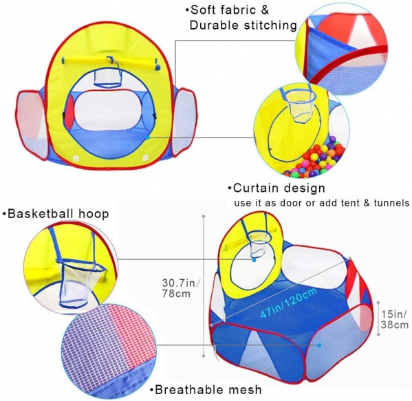 Bring endless fun to your little one’s playtime! This large pop-up ball pit tent is perfect for toddlers, featuring a bright, colorful design and a built-in basketball hoop for active play. Made from safe, durable, and easy-to-clean materials, it’s perfect for indoor or outdoor use. Folds flat for storage and travel—ideal for playrooms, parties, or backyard adventures.