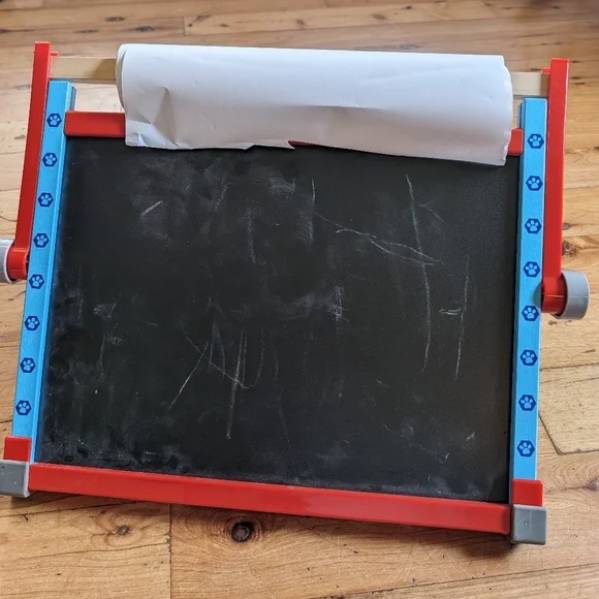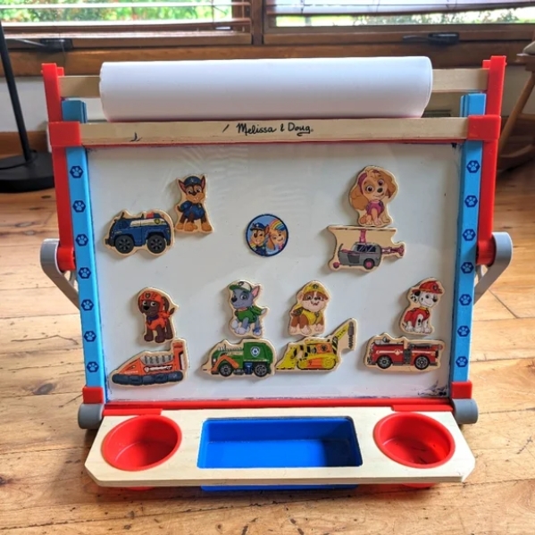 3+ years. There are lots of ways to create with this compact PAW Patrol tabletop easel with art supplies! Draw on the paper roll, make designs and write on the chalkboard, create again and again on the magnetic dry-erase surface, and fill in activity sheets. The magnetic base of the adjustable compass clings to the dry-erase board; then insert the dry-erase marker (or any drawing tool less than 9mm diameter) to draw perfect circles in different sizes! Add PAW Patrol magnets to scenes on dry-erase board or use them to hold activity sheets on the easel. The portable easel with attached wooden art supply tray folds flat for easy storage. PAW Patrol is always ready to help, inspiring preschoolers with a blend of teamwork, adventure, and humor as they develop social, emotional, and developmental skills through play.