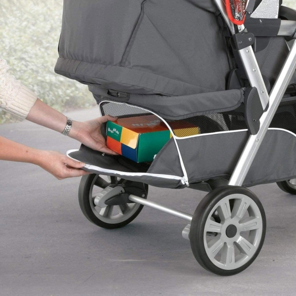 The Cortina Together has a one-hand-activated, standing fold for easier maneuvering and storage. The parent tray includes two cup holders and storage for smaller items, and an oversized basket with rear zipper access provides ample space for larger items. A padded 3-position handle comfortably accommodates mom or dad, and toe-tap brakes keep the stroller in place when parked.