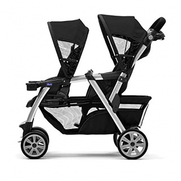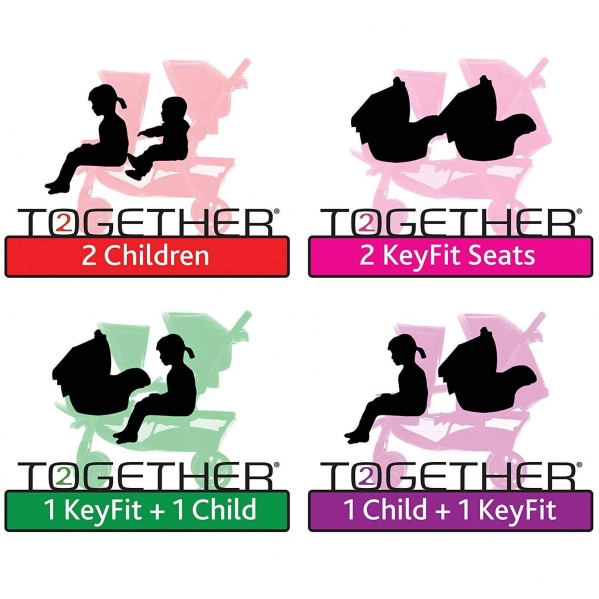 For infants, the Cortina Together Double Stroller accepts any two Chicco infant car seats (sold separately), one in each seat. The front seat folds forward and the rear seat reclines to accept the car seat with integrated click-in attachment. No adapter needed!