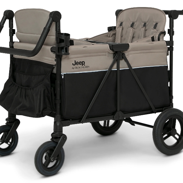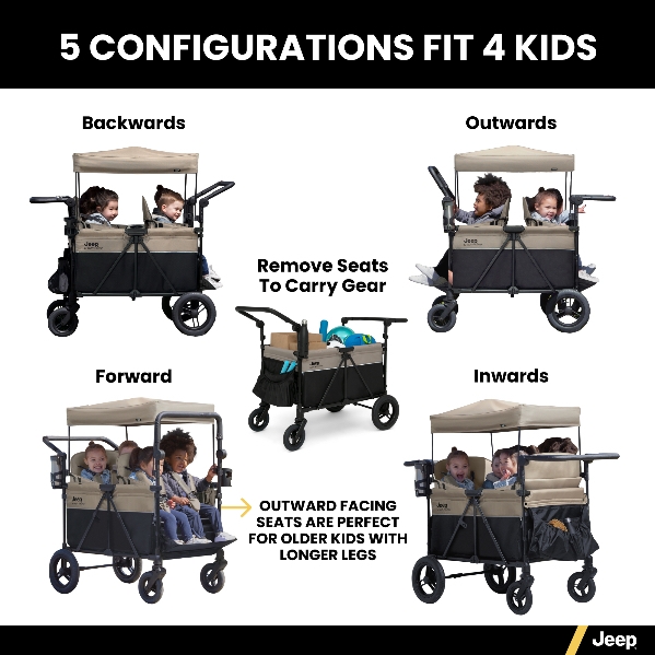 he Jeep Gladiator 4-Seater Stroller Wagon includes everything you love about Jeep wagons with room for four passengers, so you can bring the whole family along for the ride. This XL wagon is the first-of-its-kind convertible wagon that offers a range of spacious seating options to accommodate up to four children—both seats can face forward, both can face backwards, both can face inwards, both can face out in different directions, or you can remove the seats completely and use the wagon to carry all your gear. Easy-access drop-down rail lets kids get in and out easily and helps provide extra legroom. Outfitted with a multitude of convenient features to help accommodate and entertain your larger crew, this wagon comes with a removable canopy that has roll down mesh screens for ventilation or black out privacy for on-the-go naps. Take advantage of the wagon’s expansive storage. The wagon features storage pockets, zippered storage compartments under the seats, kids snack tray, plus two parent cup holders. Two adjustable leatherette handlebars ensure a comfortable grip for parents of all heights, while the large, puncture-proof tires provide a smooth ride on any terrain. The wagon’s flat fold makes it easy to store and transport. It’s the perfect all-in-one solution for growing families. Plus, it’s GREENGUARD Gold Certified, which means it’s built to contribute to air for a healthy environment. Recommended for 6 months to 42" and holds up to 50 lbs. per seat, 200 lbs. total.