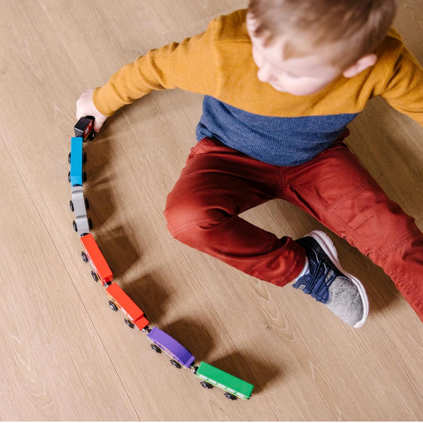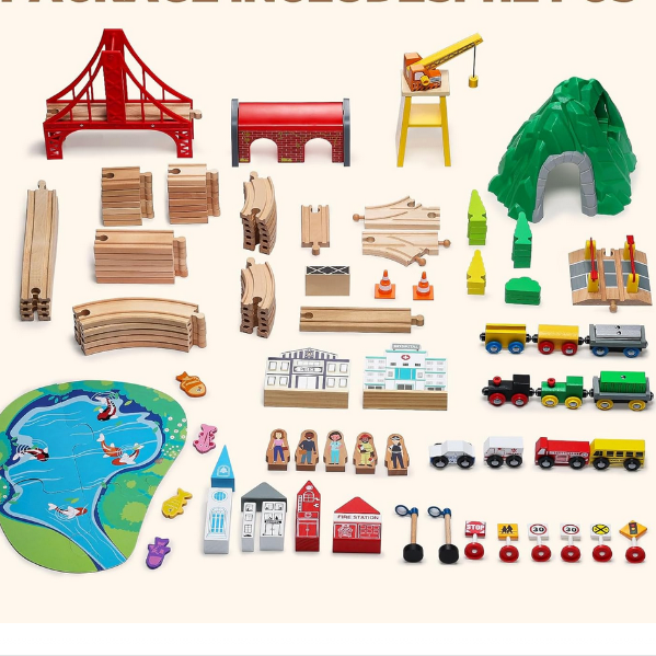 Learning is fun with trains, vehicles, tracks. Build a city, play trains! This generous set of trains, vehicles and tracks will bring hours of enjoyment to your little one! This set is ideal for creativity and imaginative play. Images show the included set and additional cars and track pieces.
