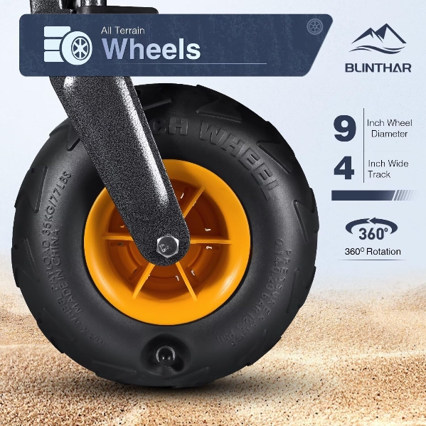 【Big All-Terrain Balloon Wheels】Collapsible folding wagon with 9" diameter 4" wide big all-terrain balloon wheels move smoothly for any occasion, such as sand, camping, shopping, gardening, fishing, barbecues, parcel transport, and more. Especially suitable for use on the beach, the wide tires ensure smooth progress. NOTE: Please leave a gap of at least 0.8-1.2inch(2.5-3PSI)between the top of balloon wheel and the steel frame.